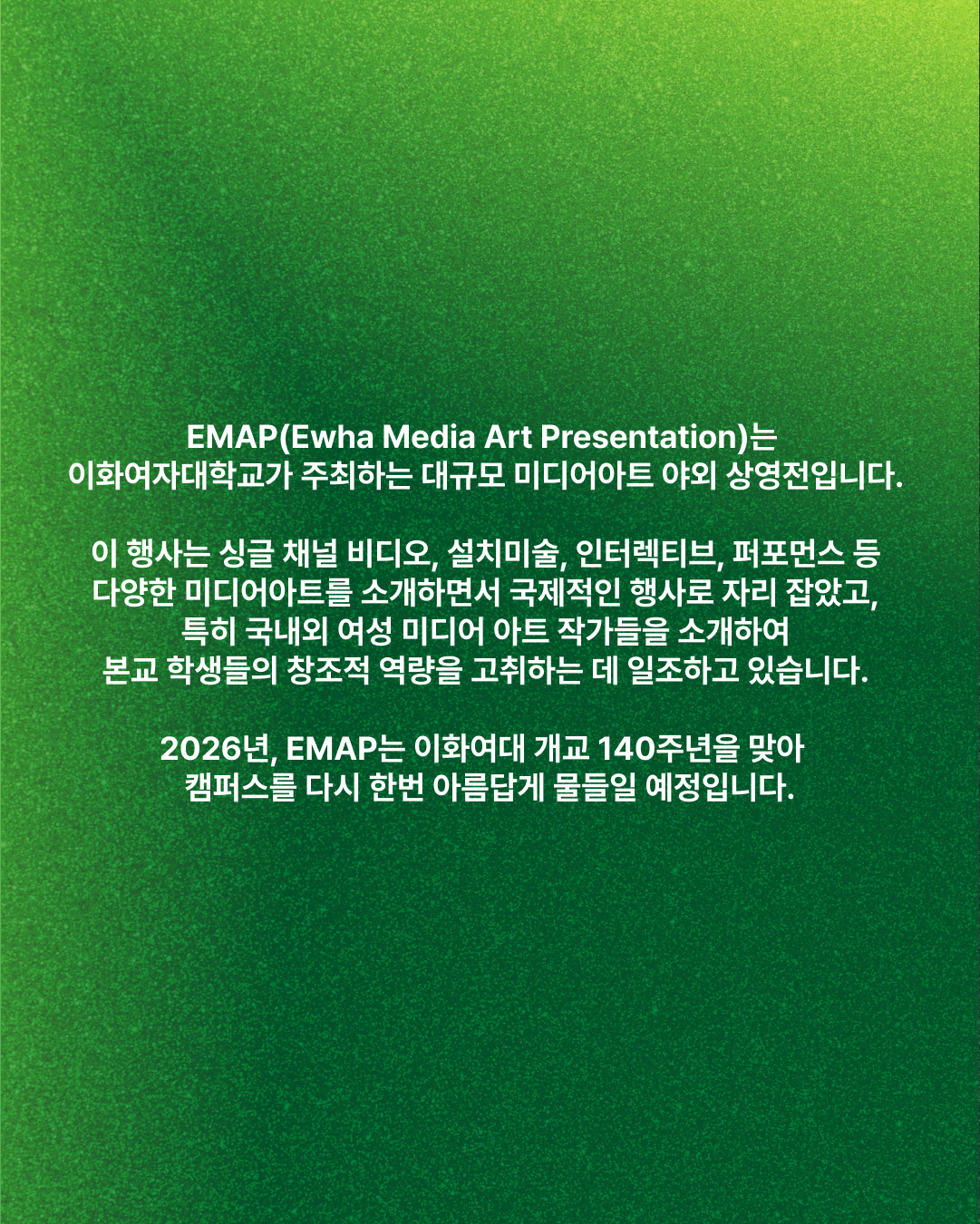개교 140주년을 맞아 2026 EMAP가 캠퍼스를 다시 한번 아름답게 밝히려 합니다. 함께 EMAP를 만들어갈 소중한 크루를 모집합니다!🍀