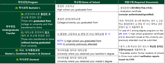 d) (For first-time D-2 visa applicants after joining their current degree programme at Ewha) Scanned graduation certificate from the previous school attended*