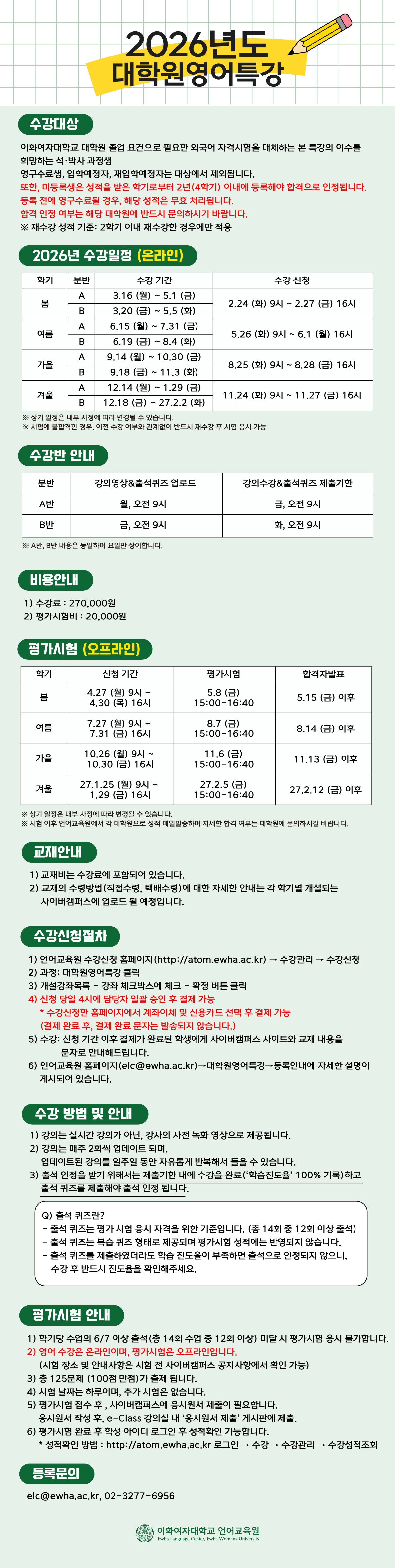 ※ 2026 봄학기 대학원영어특강은 비대면 수업으로 진행되나, 평가시험은 오프라인으로 진행됩니다.