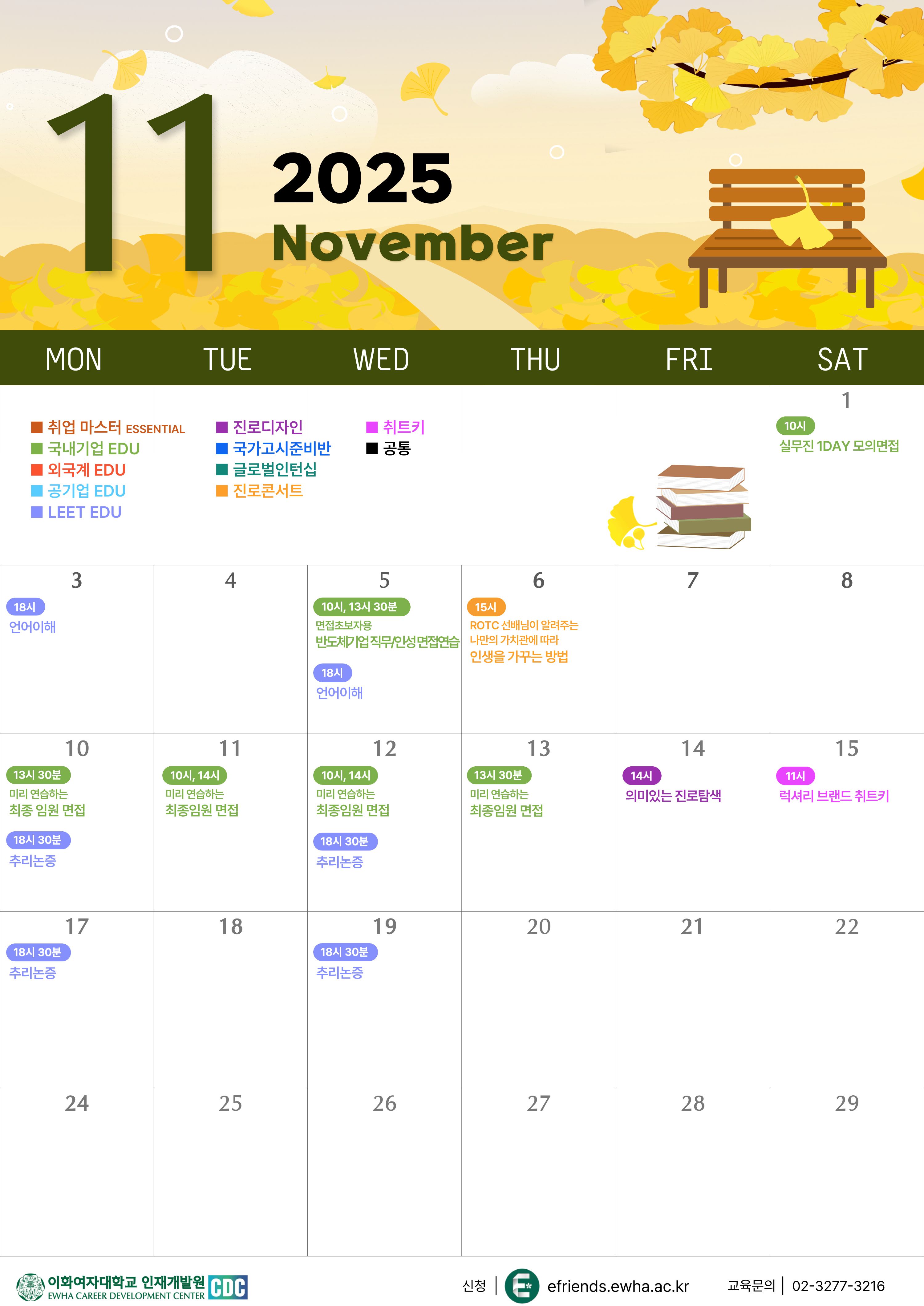 fnctId=bbs,fnctNo=260 글번호 32852 작성일 2025.11.03 수정일 2025.11.03 작성자 emusic 조회수 251 [학사] 25년 11월 진로취업교육 일정 안내(25년 11월캘린더) '이화여자대학교 인재개발원' 카카오톡 채널 추가를 해두면 더 많은 인재개발원 소식을 받아보실수 있습니다. 첨부파일 첨부파일이(가) 없습니다.