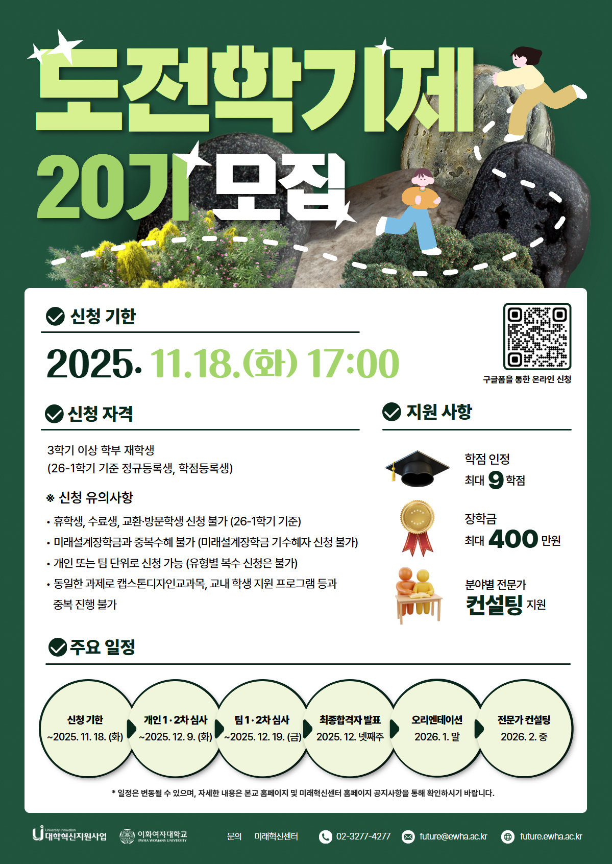 fnctId=bbs,fnctNo=260 글번호 32864 작성일 2025.11.05 수정일 2025.11.05 작성자 emusic 조회수 196 [학사] (학부) 대학혁신지원사업 20기 도전학기제 공모전 시행 안내 첨부파일 붙임2. 20기 도전학기제 모집 공고문 및 관련 서식.zip